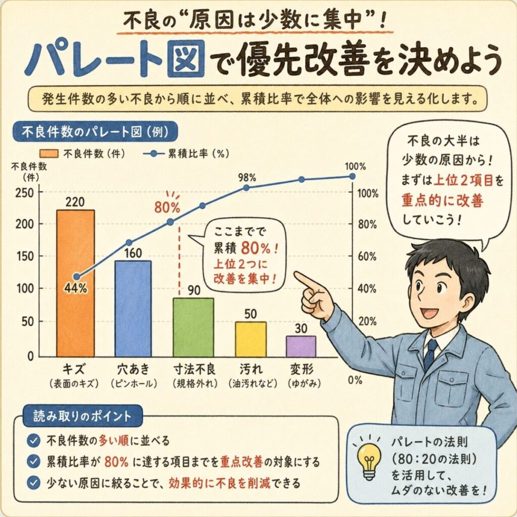 まずは、不良件数や損失金額を並べて、どの不良が本当に痛いのかを見える化します。ここで使うのがパレート図です。