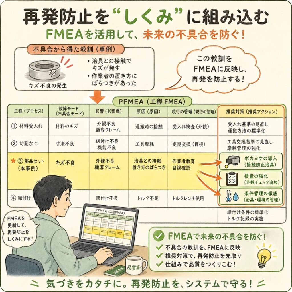 そこで使うのがFMEAです。今回つかんだ故障モード、原因、対策をFMEAへ戻すことで、再発防止を文書と仕組みに変えます。