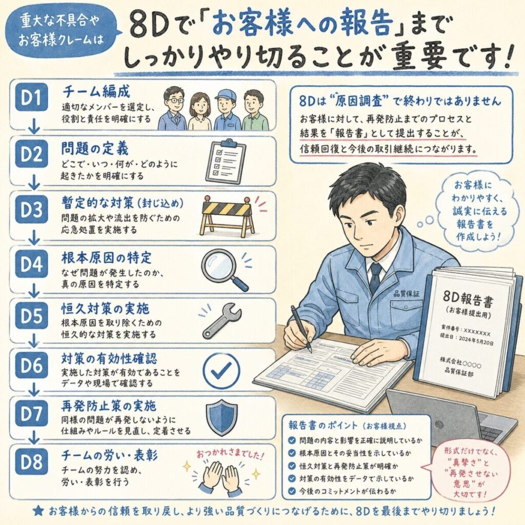 そして、対策はFMEAや標準へ戻し、必要なら8D報告書で客先対応までつなげます。
