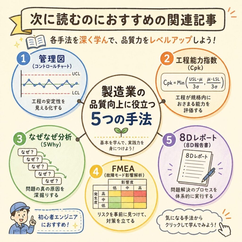 この順番を覚えておけば、会議で「次に何する?」と聞かれても迷いません。品質管理の会話が一気に整理されます。