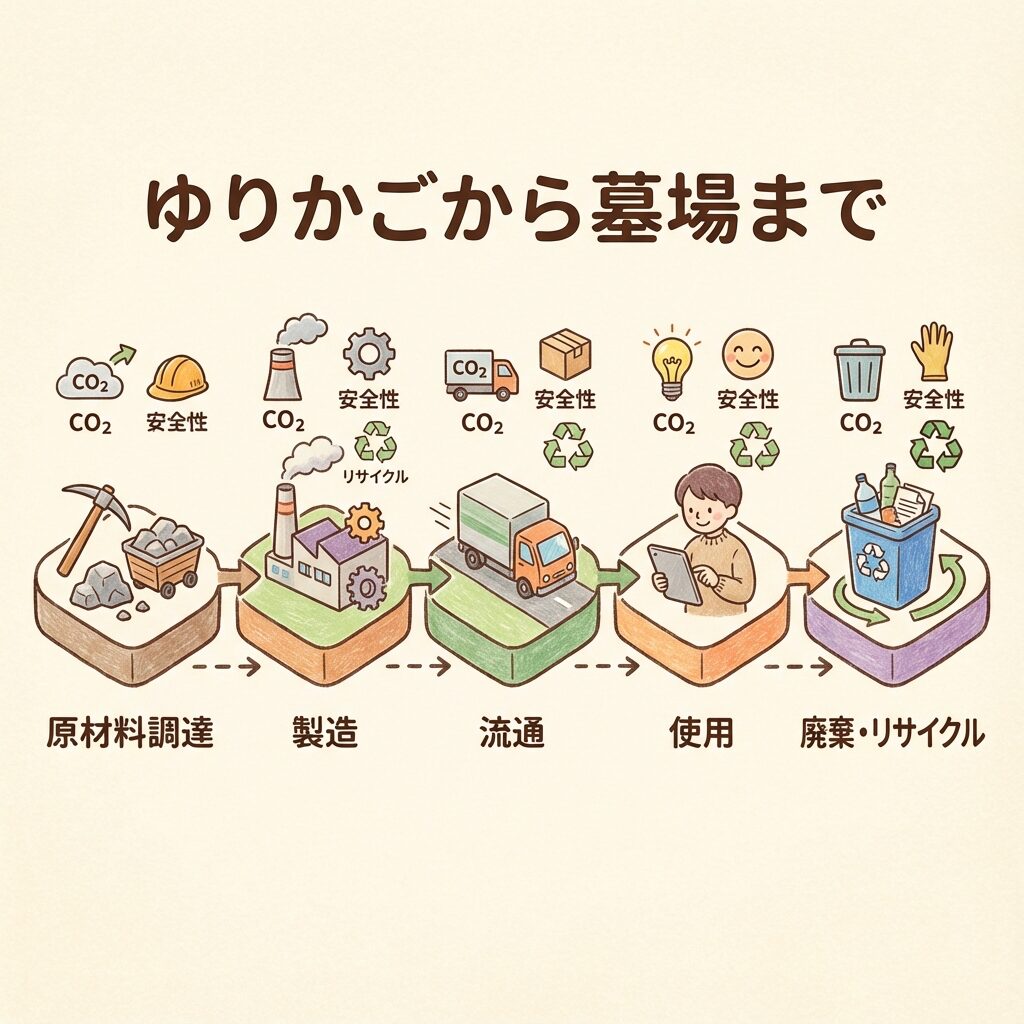 | ♻️ リサイクル性 | 捨てた後も活かす | 分解しやすい構造、素材の表示 |