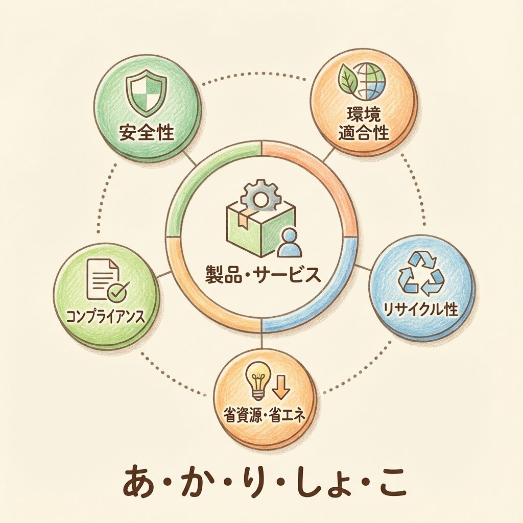 - 5つの柱:安全性・環境適合性・リサイクル性・省資源・コンプライアンス(覚え方:あ・か・り・しょ・こ)