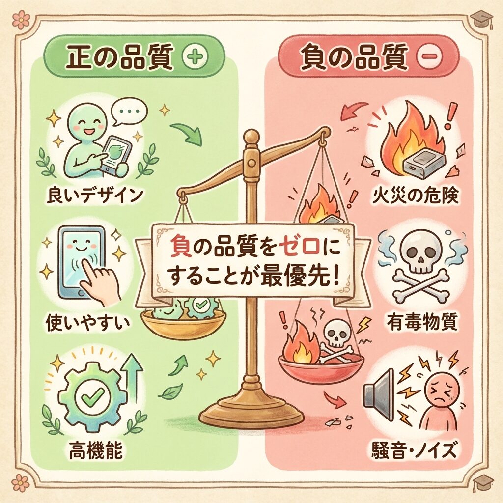 | ➖ 負の品質 | あってはならない特性 | 発火する、有害物質を含む、騒音がうるさい |