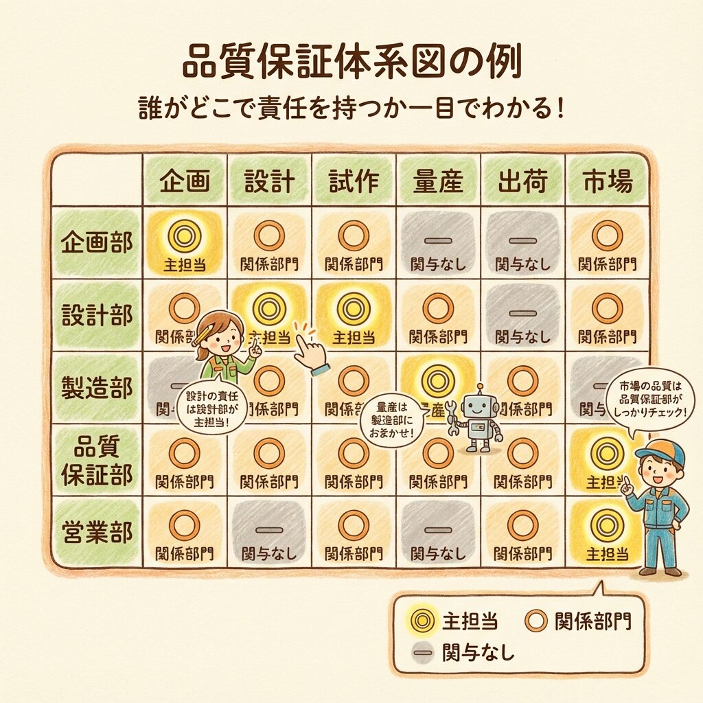 このように、品質保証体系図を見れば、「どの部門が」「どの工程で」「主担当として責任を持つか」が一目でわかります。