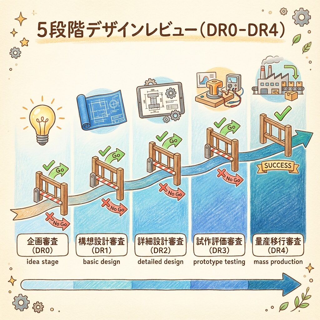 - 5つのDRステージ:DR0(企画)→DR1(構想)→DR2(詳細)→DR3(試作)→DR4(量産)