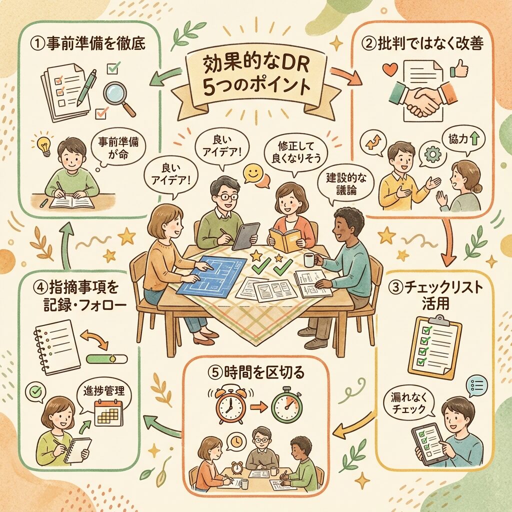 DRを形式的なものにせず、本当に問題を発見できる場にすることが大切です。そのためには、事前準備、適切な参加者、建設的な議論が欠かせません。