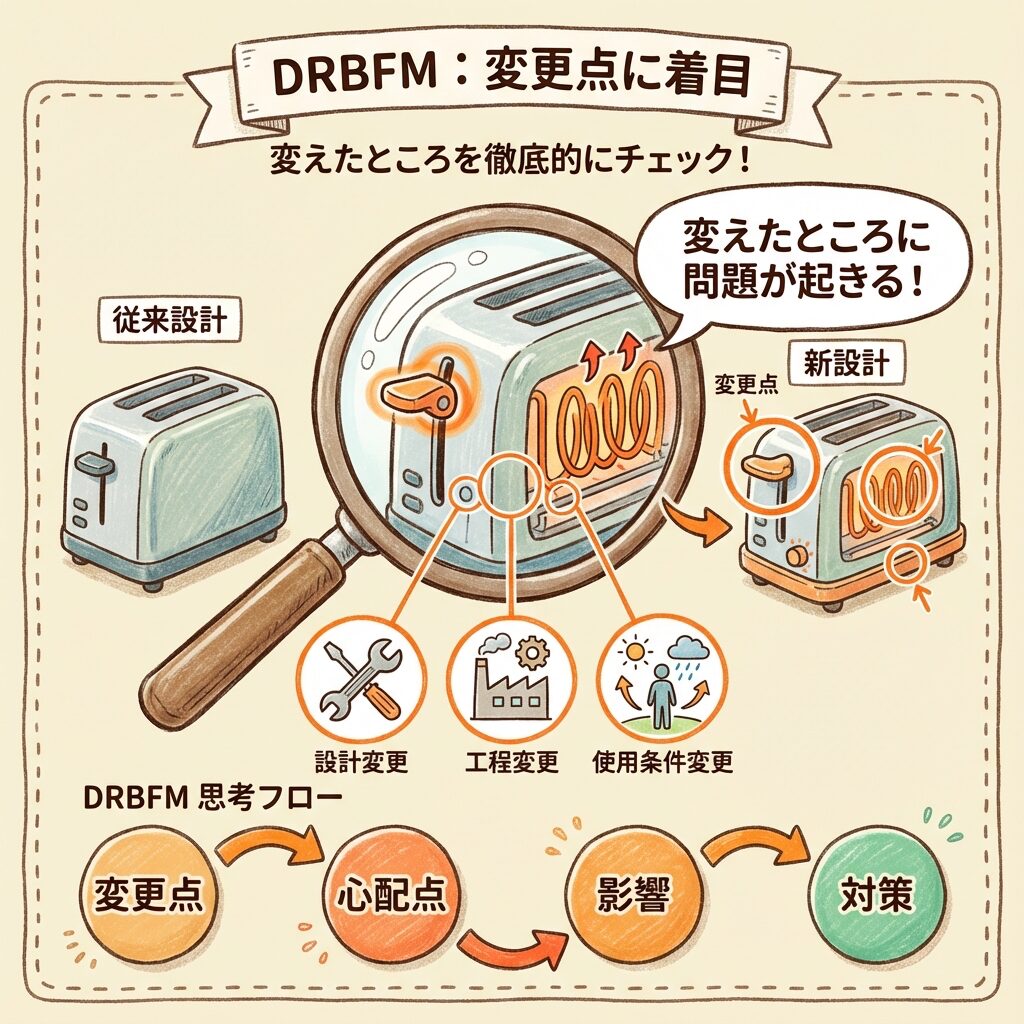 - DRBFMの3つの変化:設計変更、工程変更、使用条件変更