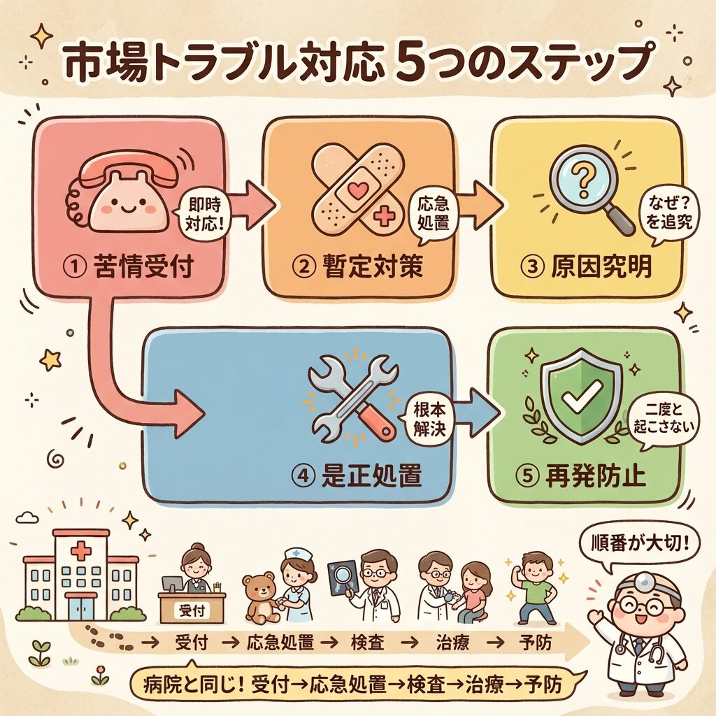 この記事では、市場トラブル対応と苦情処理の全体像を解説しました。
