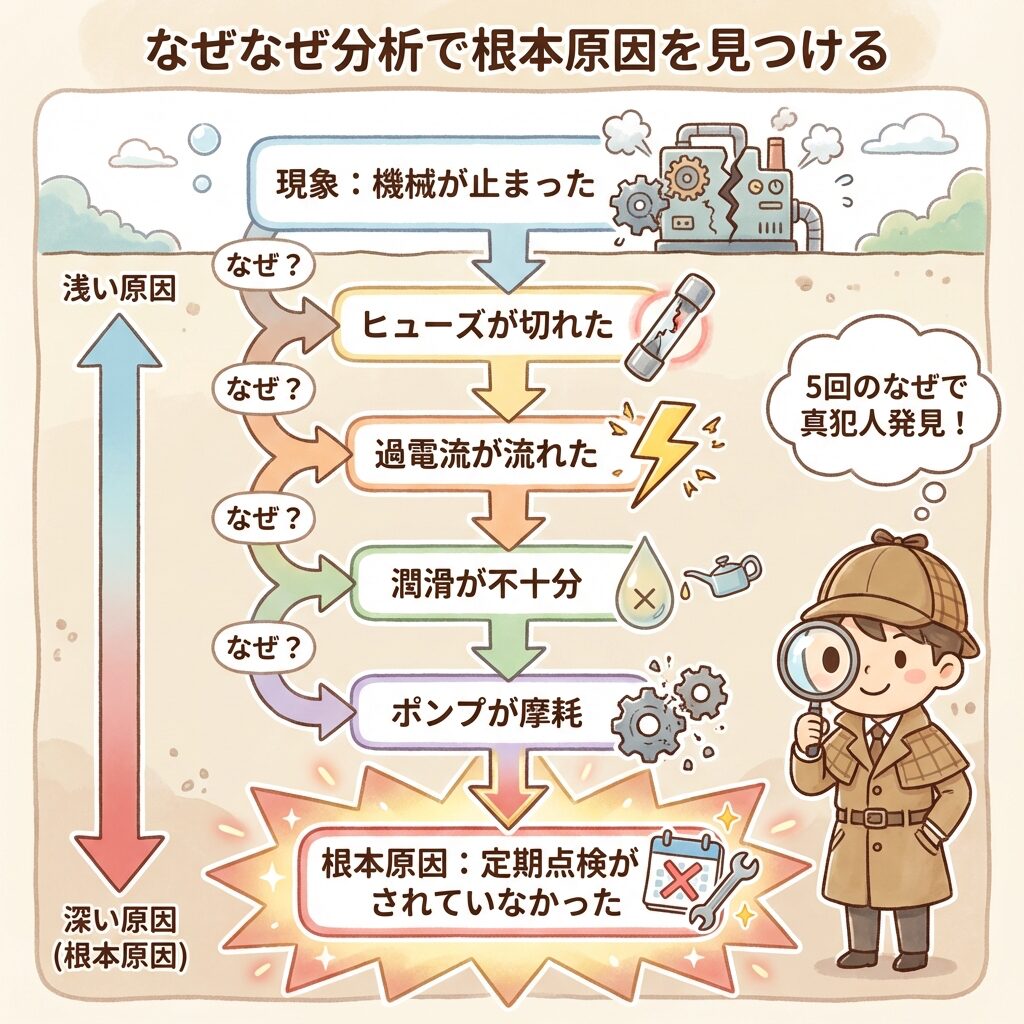 ✅ 原因究明では「なぜなぜ分析」で根本原因まで掘り下げる