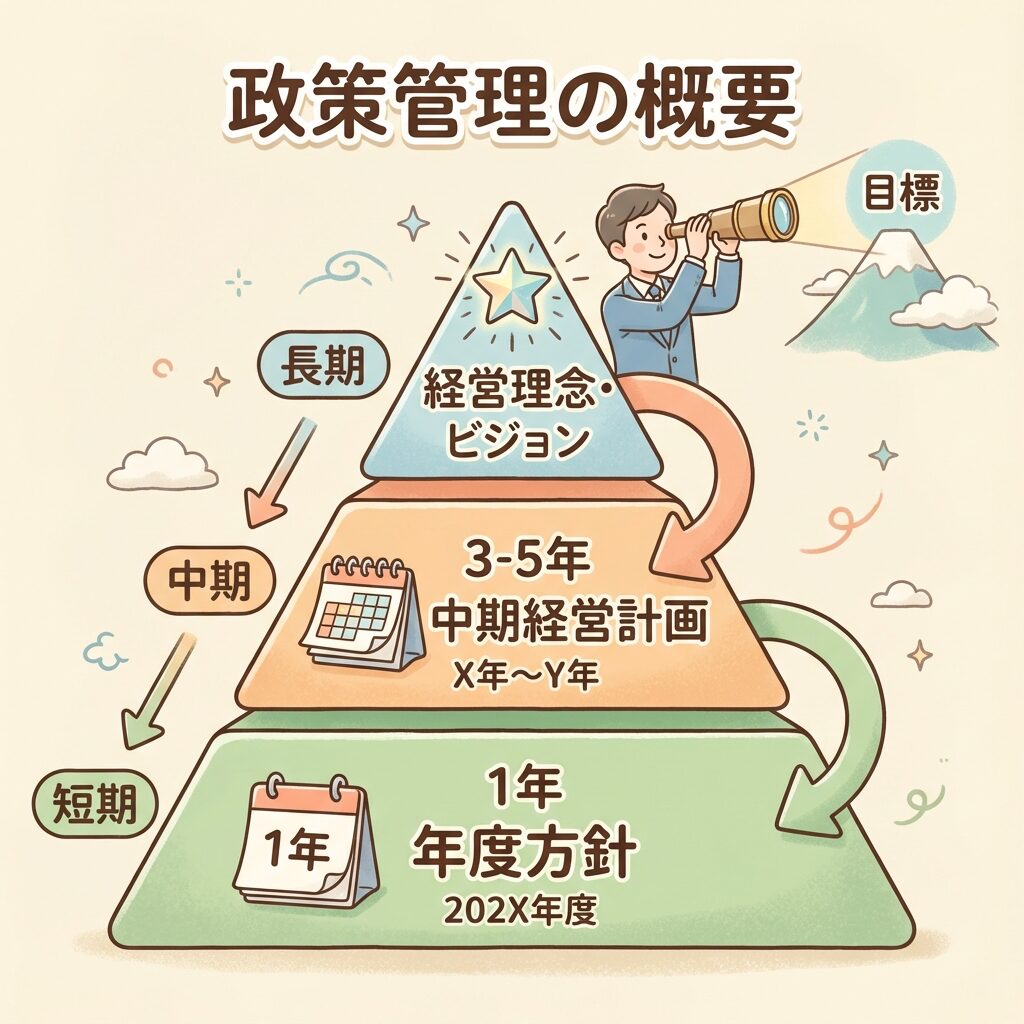 - 方針管理は「山登り」:経営理念→中期計画→年度方針の階層で、着実に目標に向かう