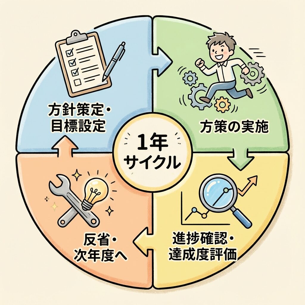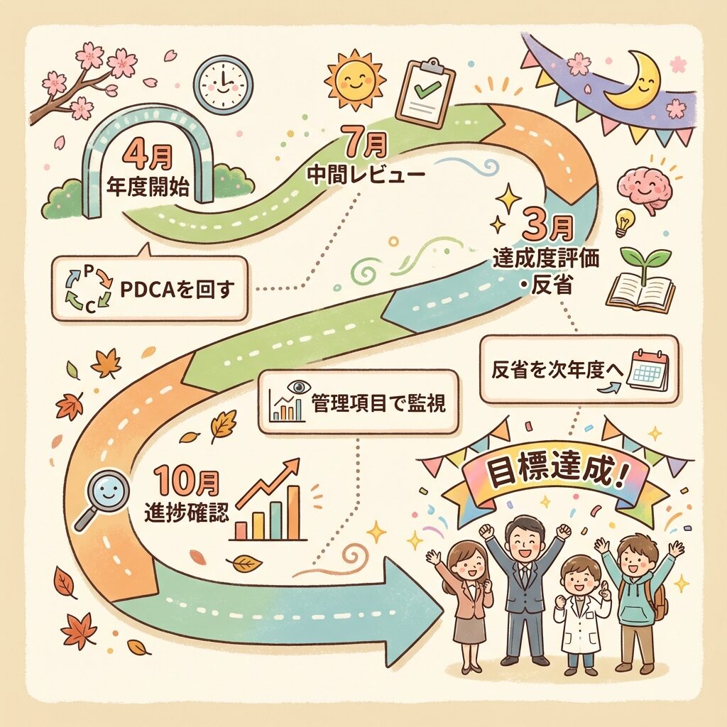 - PDCAサイクルを1年で回す:計画→実行→確認→処置のサイクルで目標を達成し、次年度につなげる
