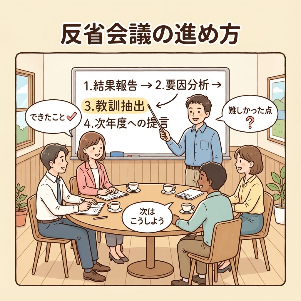 反省会議は、達成度評価と要因分析の結果を共有し、組織として教訓を引き出す場です。