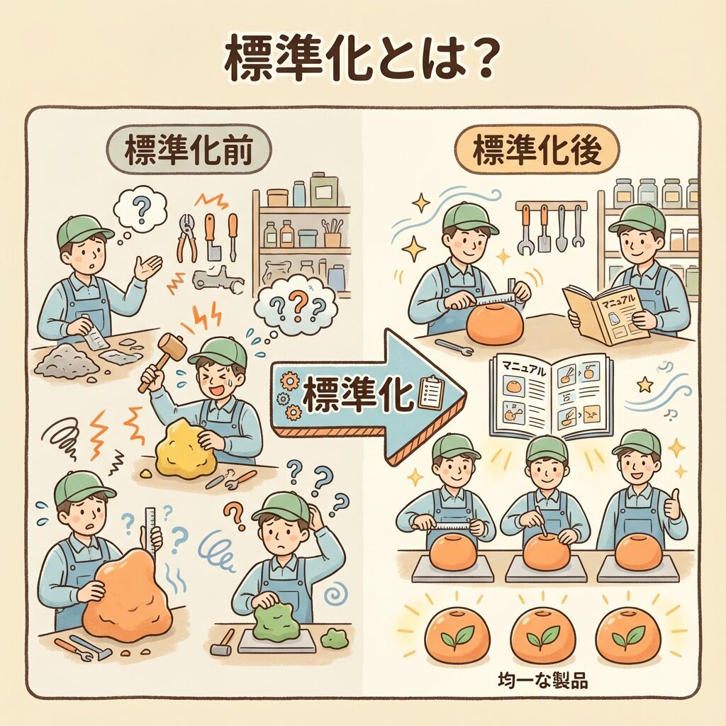 標準化とは、「最も良いやり方」を決めて、みんながそれに従うようにすることです。