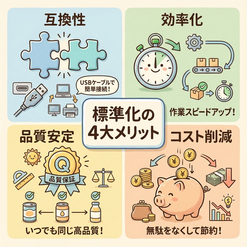 • 標準化の4大メリット(互換性・効率化・品質安定・コスト削減)