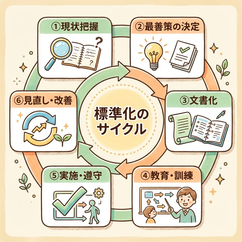 標準化は、一度作って終わりではありません。継続的に見直し・改善していくサイクルです。