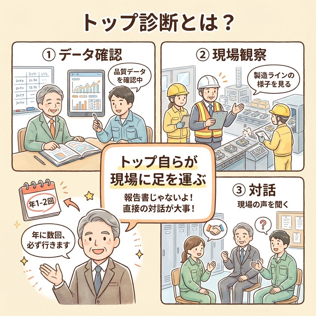 トップ診断(社長診断)とは、経営者自らが現場を訪問し、方針の浸透状況や活動の実態を直接確認する活動です。