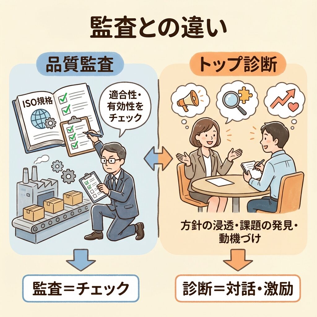 監査は「試験官」、トップ診断は「応援団長」というイメージです。どちらも大切ですが、役割が違います。