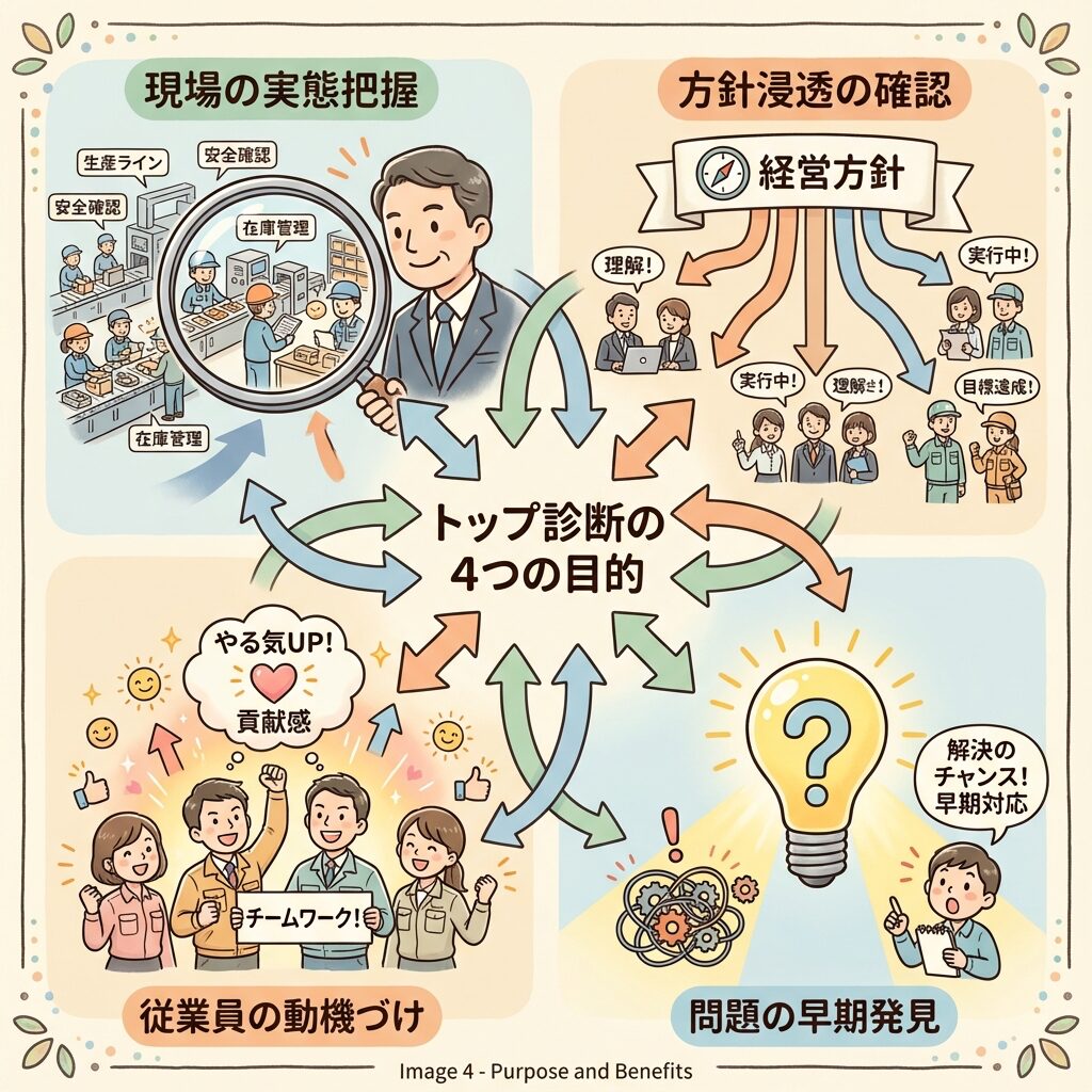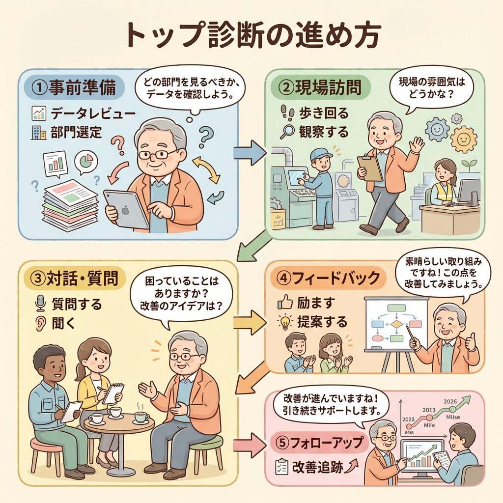 - トップ診断の目的を「経営者の現場訪問」として理解