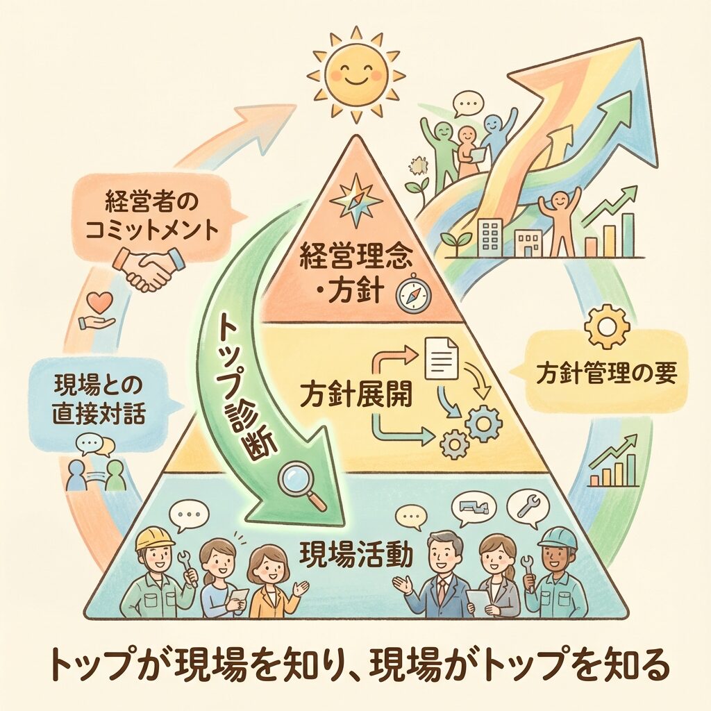 トップ診断は、経営者にとって「現場を知る」機会であり、現場にとって「経営者を知る」機会でもあります。この双方向のコミュニケーションが、方針管理を成功に導くのです。