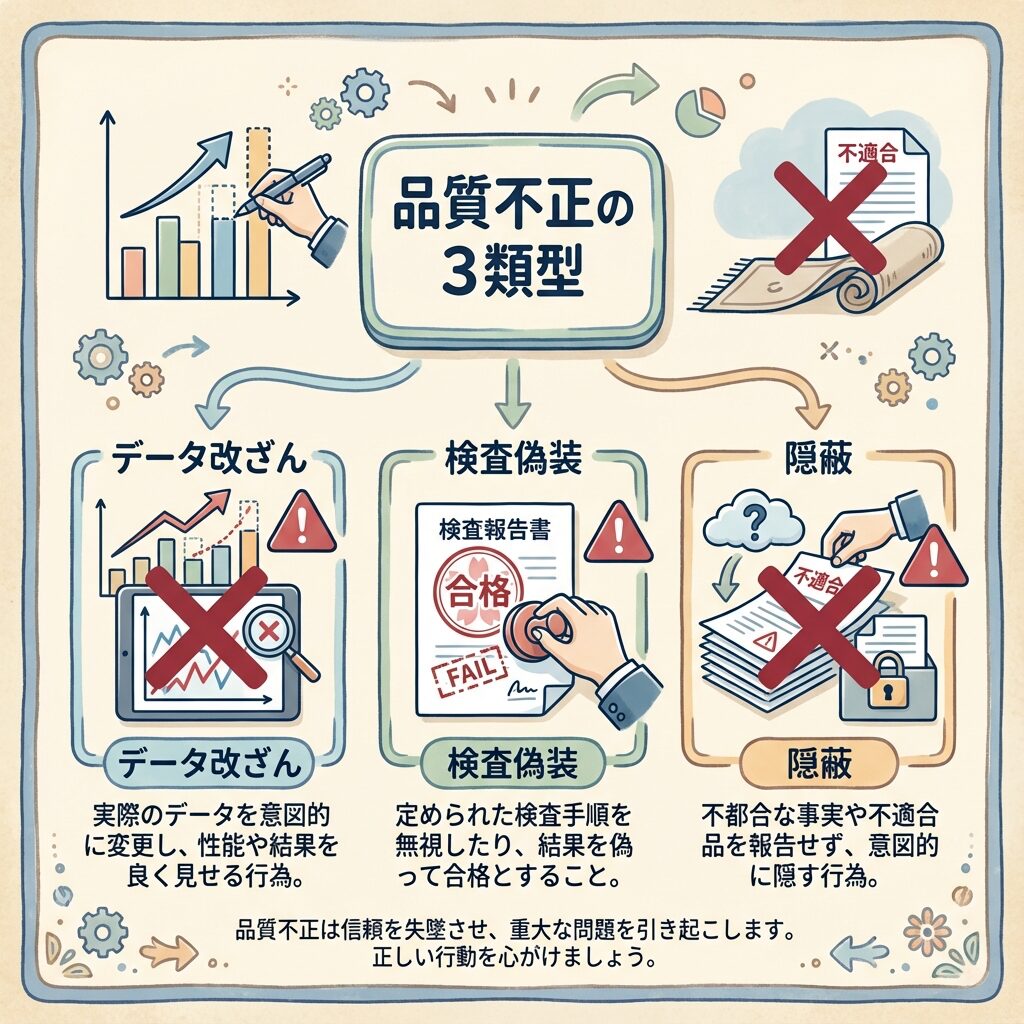 - 品質不正にはデータ改ざん・検査偽装・隠蔽の3類型がある
