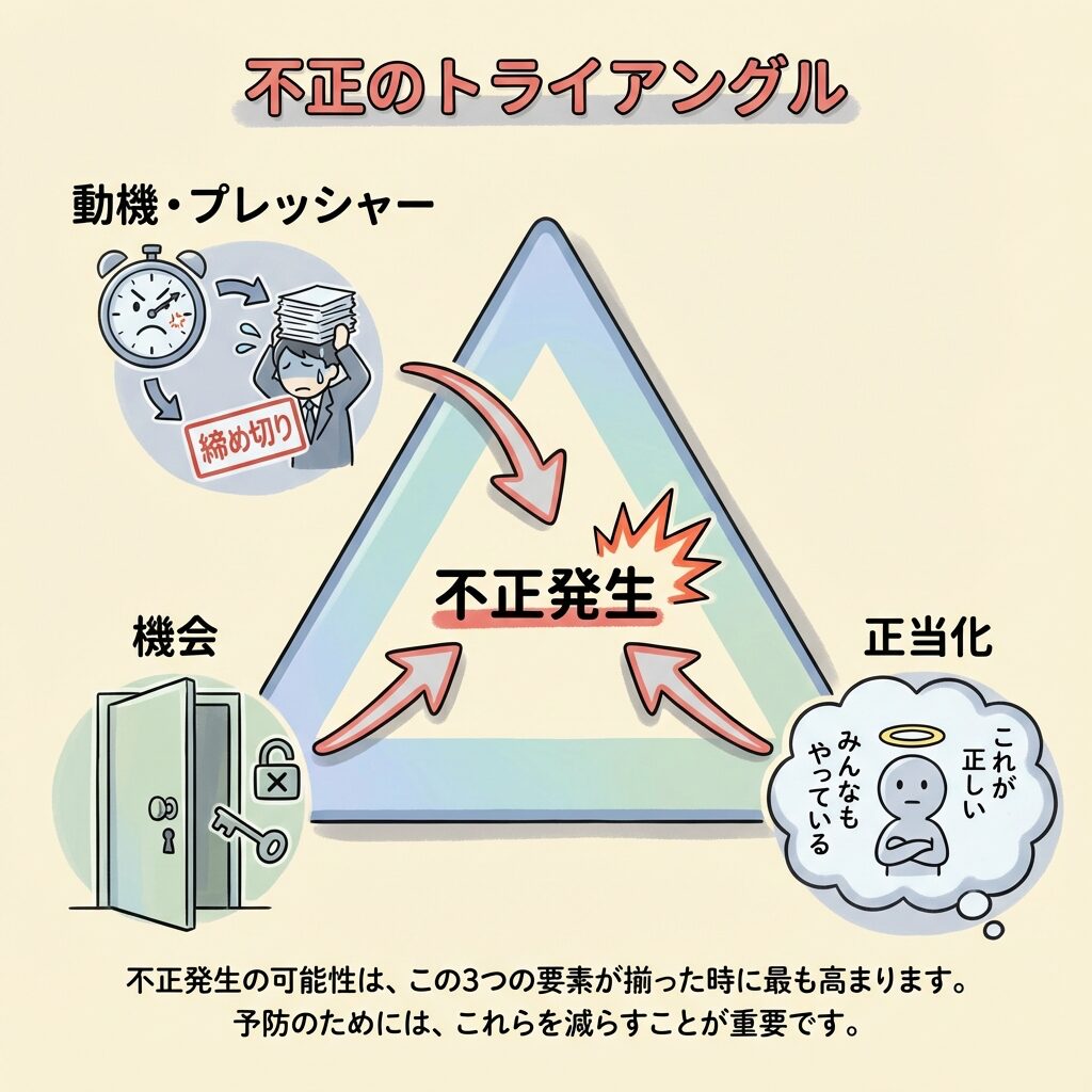 - 不正は「動機・機会・正当化」の3要因が揃うと発生しやすい(不正のトライアングル)