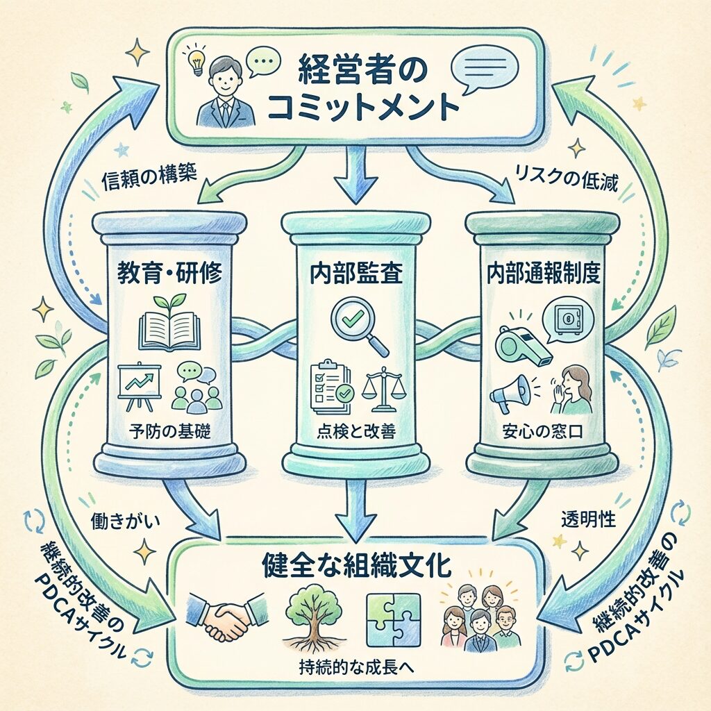 - 不正を防ぐには経営者のコミットメント、内部統制、教育、心理的安全性が必要