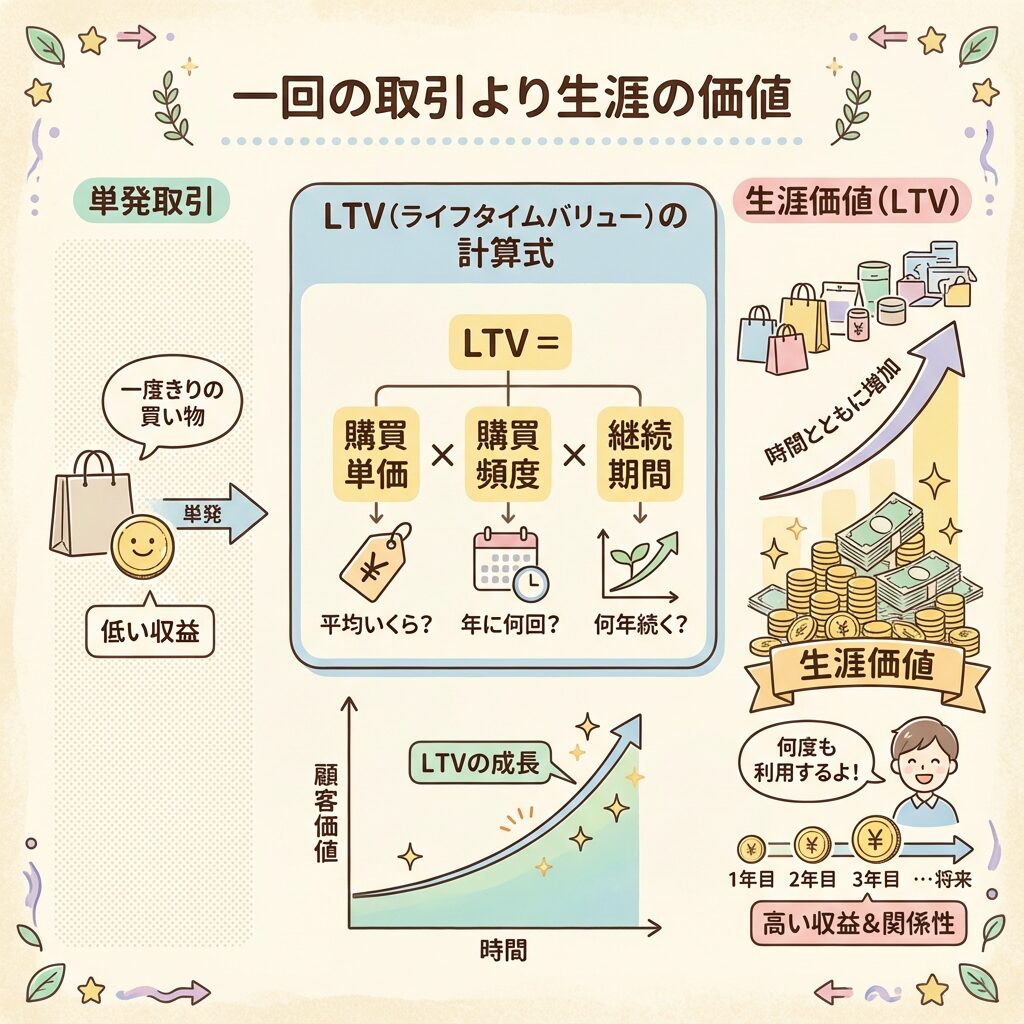 一人の顧客が生涯を通じて企業にもたらす価値の総額。「1回の購入額」ではなく、「その顧客との取引が続く限りの累計額」で顧客価値を評価する考え方。