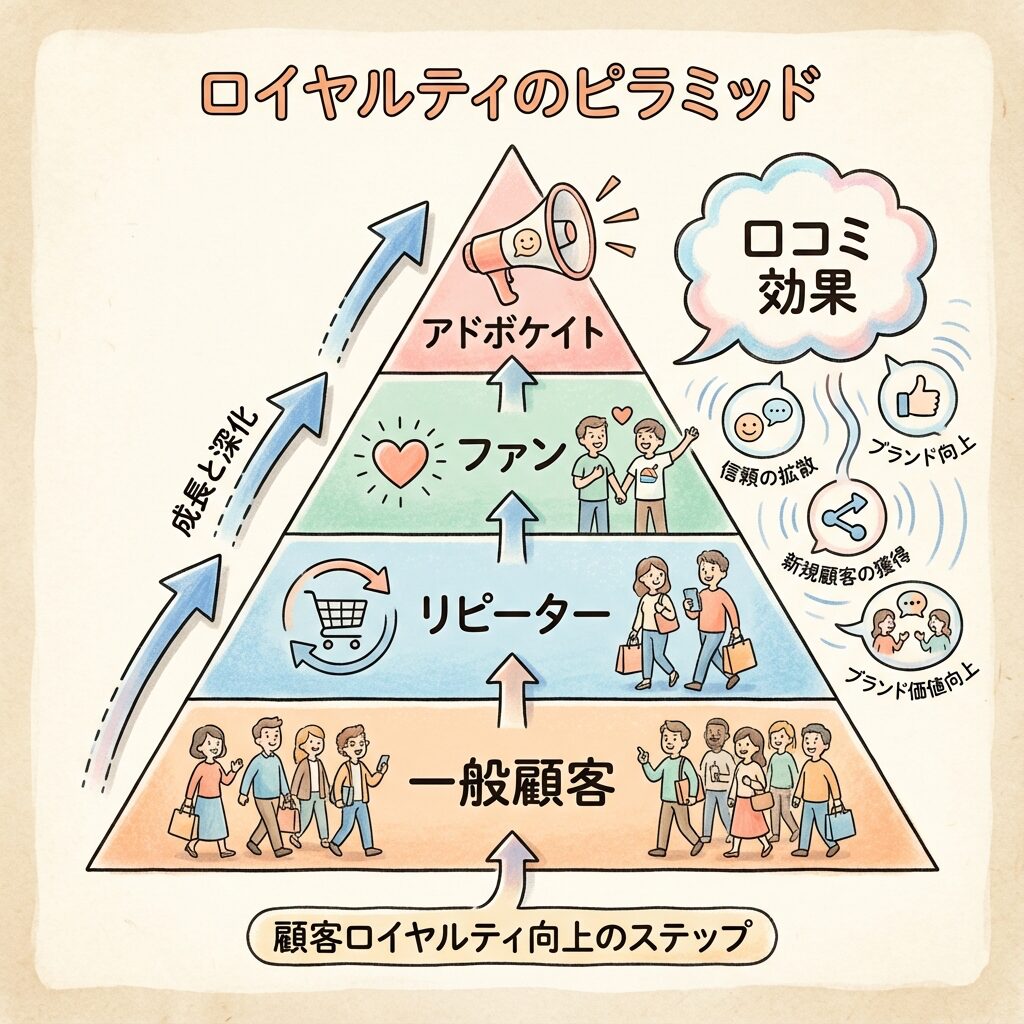 - ファン:ブランドに愛着を持つ顧客(感情的なつながり)