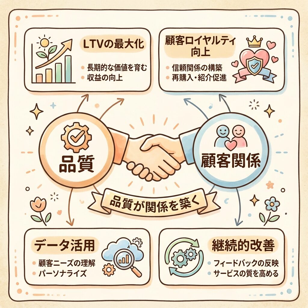 - 品質が良い → ロイヤルティ向上 → LTV増加という因果関係がある