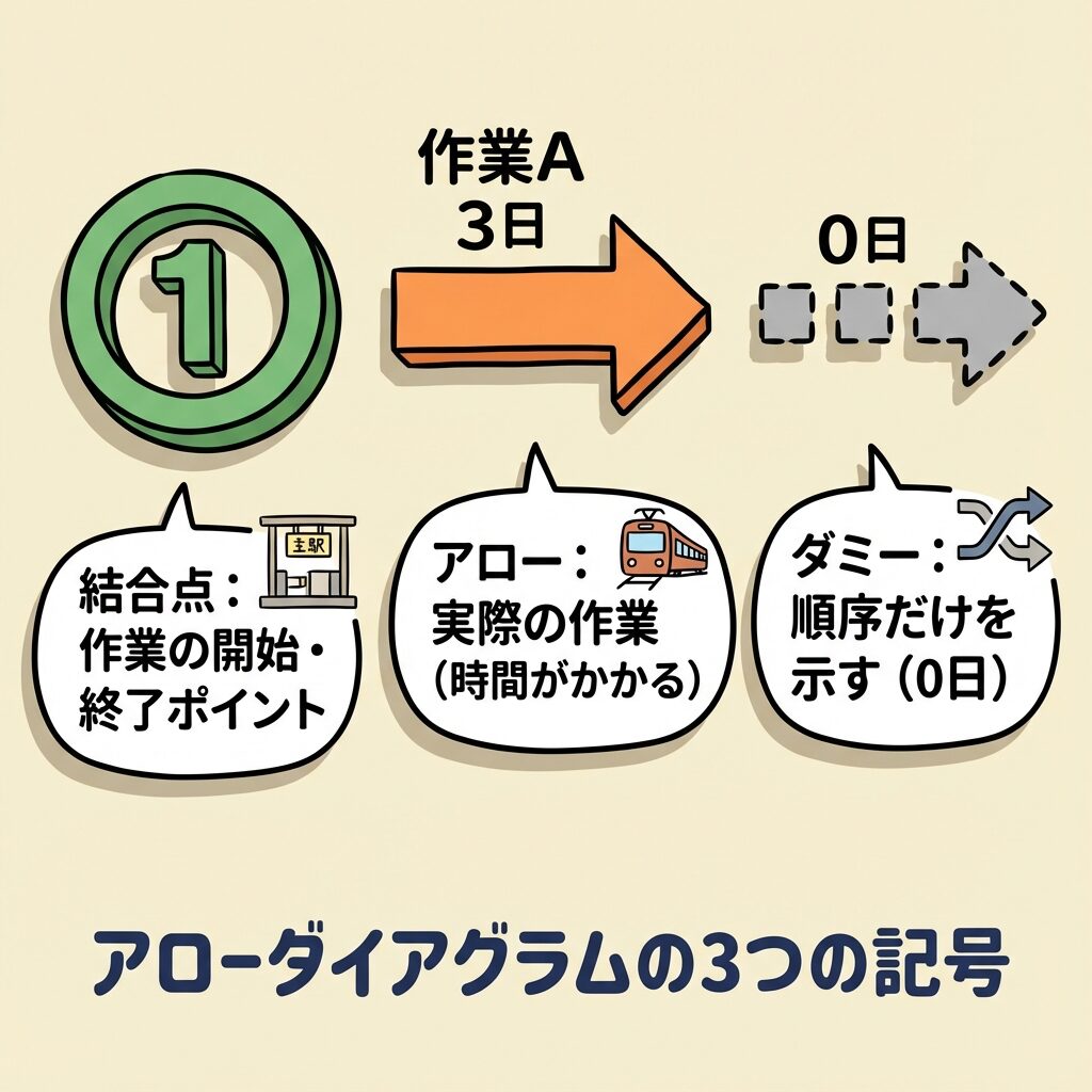 ・ノード(丸)=結合点、アロー(矢印)=作業、ダミー(点線)=順序関係のみ