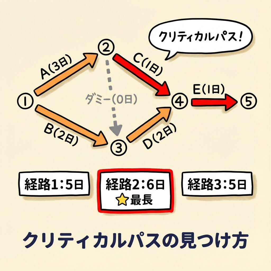 | 経路2 | A→ダミー→D→E | 3 + 0 + 2 + 1 | 6日 ←最長! |