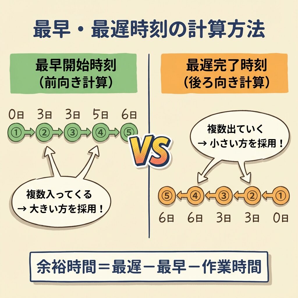 - 「最早開始時刻」「最遅完了時刻」の違いがごちゃごちゃになる