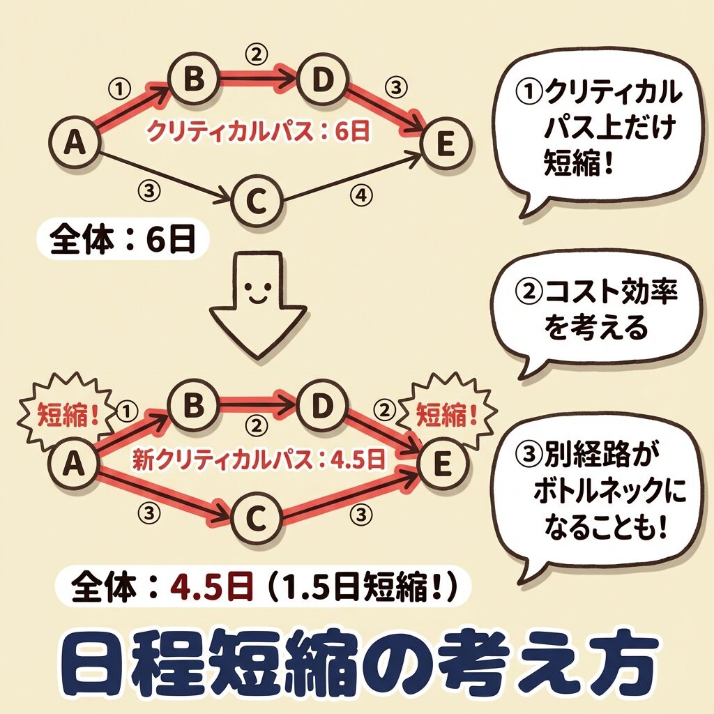 プロジェクトの納期を早めたいとき、「どの作業を短縮すればいいか?」という問題がよく出題されます。