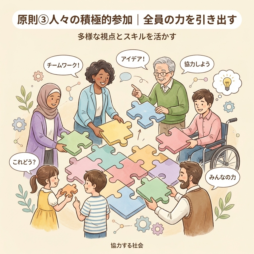 | 3 | 人々の積極的参加 | 全員が力を発揮できる環境を作る |