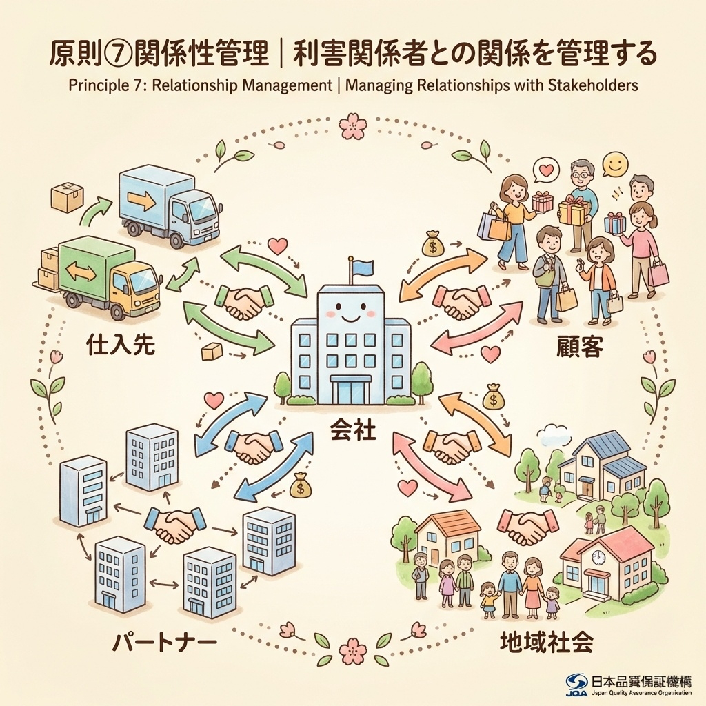 「顧客重視」との違いに注意してください。「顧客重視」は顧客に焦点を当てますが、「関係性管理」は供給者・パートナー・地域社会など、顧客以外の利害関係者にも範囲を広げています。