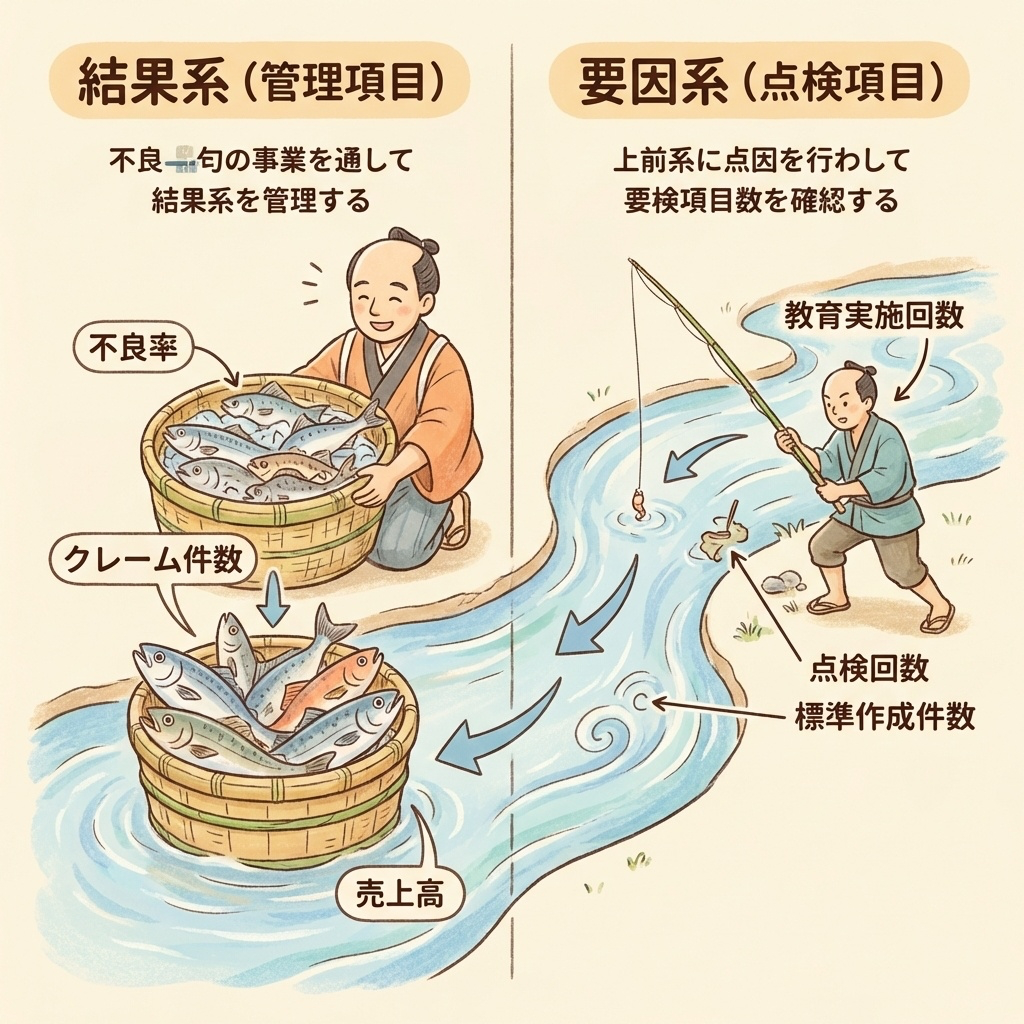 | 結果系(管理項目) | 不良率、クレーム件数など(結果を測る) |