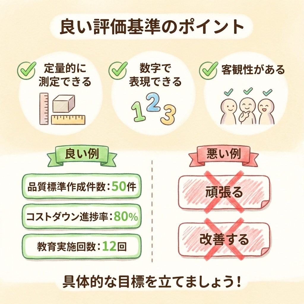 「頑張る」「改善する」「努力する」などの曖昧な表現はNGです。数字で測れないものは、達成できたかどうか判断できません。