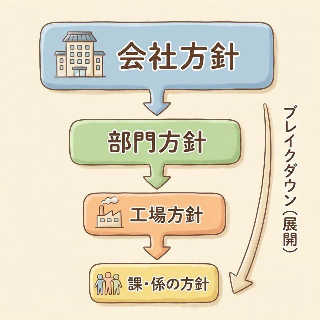 | 方針展開 | 会社方針 → 部門方針 → 工場方針 → 課・係の方針 |