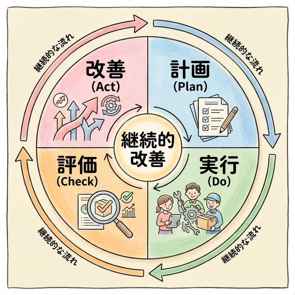 このサイクルを「回し続ける」ことで、品質は少しずつ向上していきます。ISO 9001は、このPDCAサイクルを組織全体で回すための「枠組み」を提供しているのです。