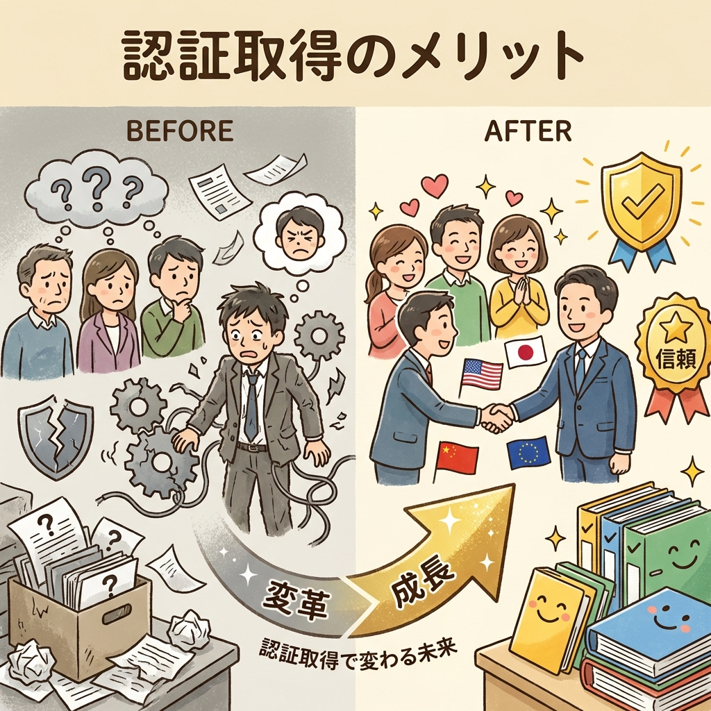 - 認証取得により、信頼向上・業務効率化・グローバル対応などのメリットがある