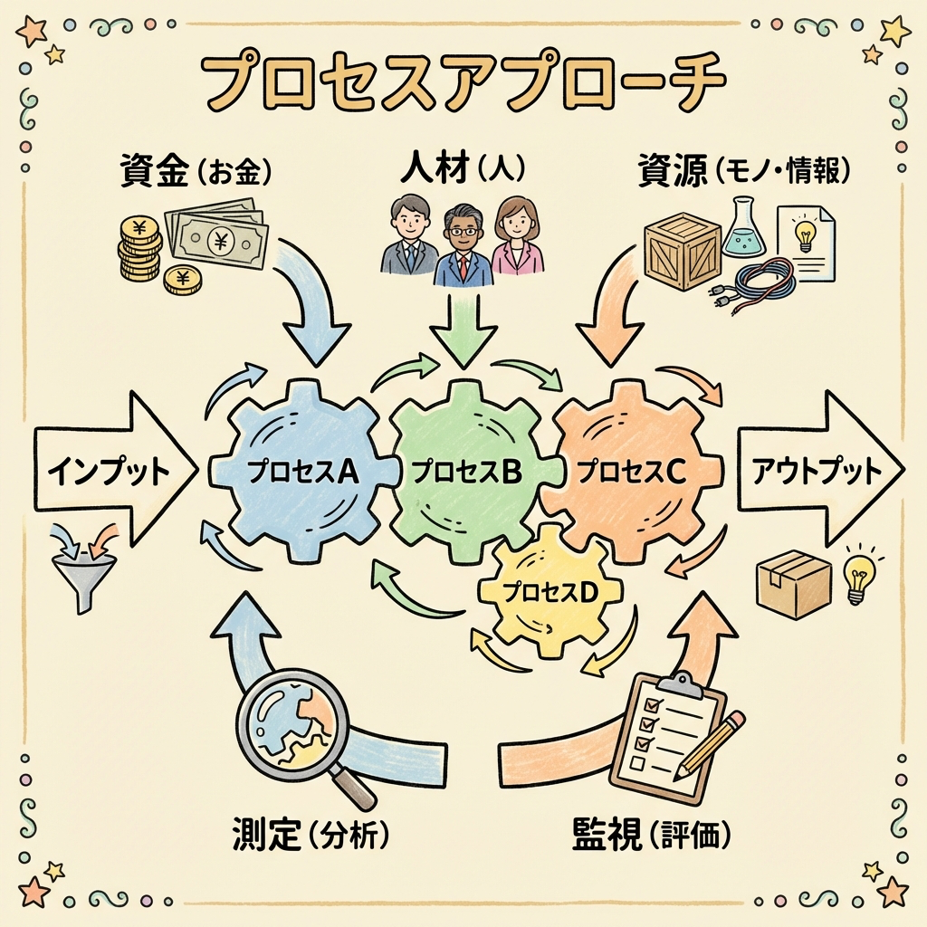プロセスアプローチでは、「各プロセスの責任者は誰か」「どんな資源が必要か」「どう測定・改善するか」を明確にします。