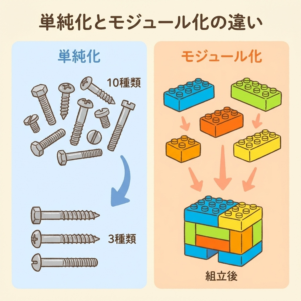- 単純化は種類を減らす、モジュール化は組み合わせで多様化
