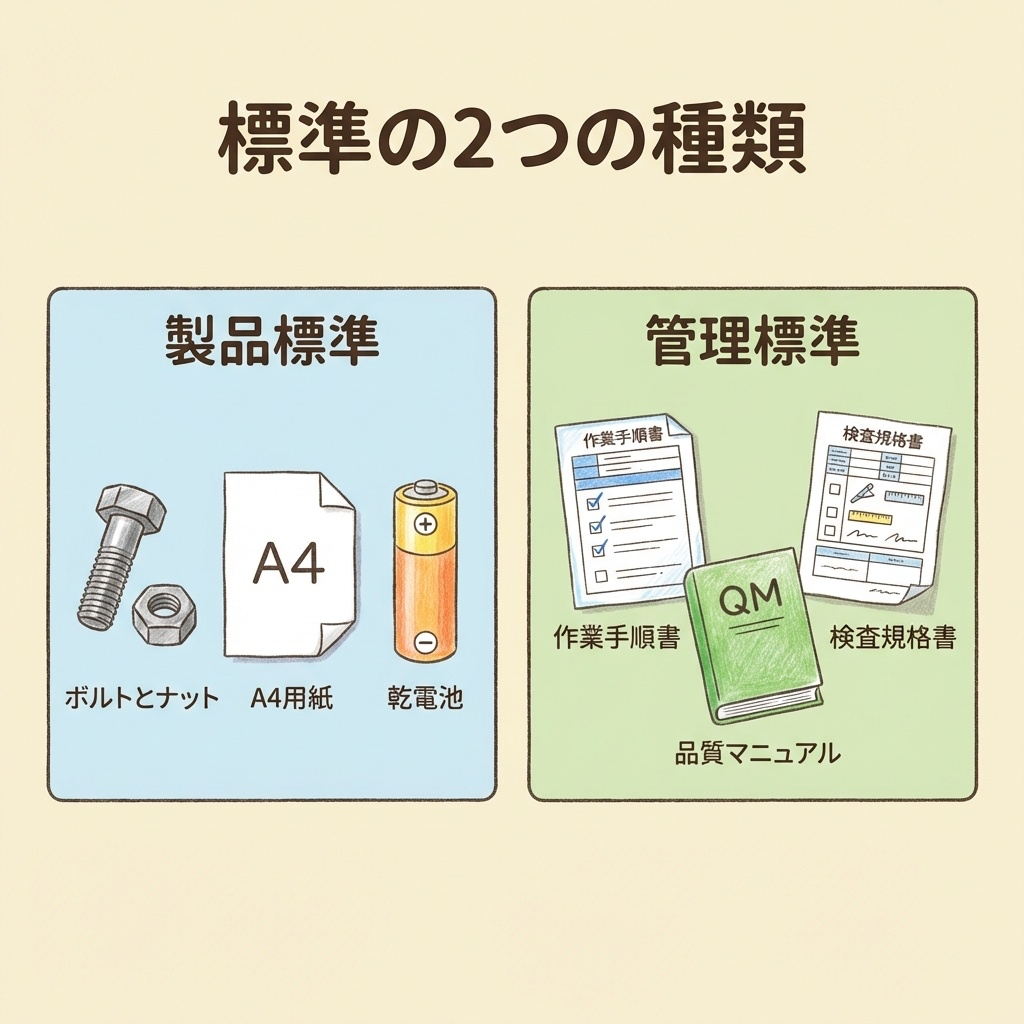 - 製品標準(モノ)と管理標準(コト)の2種類