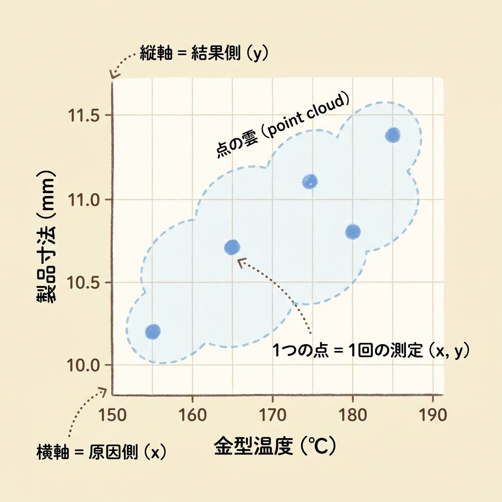 たとえば、あなたが品質保証部で「金型温度と製品の寸法精度に関係があるか調べてほしい」と頼まれたとします。このとき、横軸に「金型温度(℃)」、縦軸に「製品寸法(mm)」をとり、過去のデータを1点ずつ打っていきます。