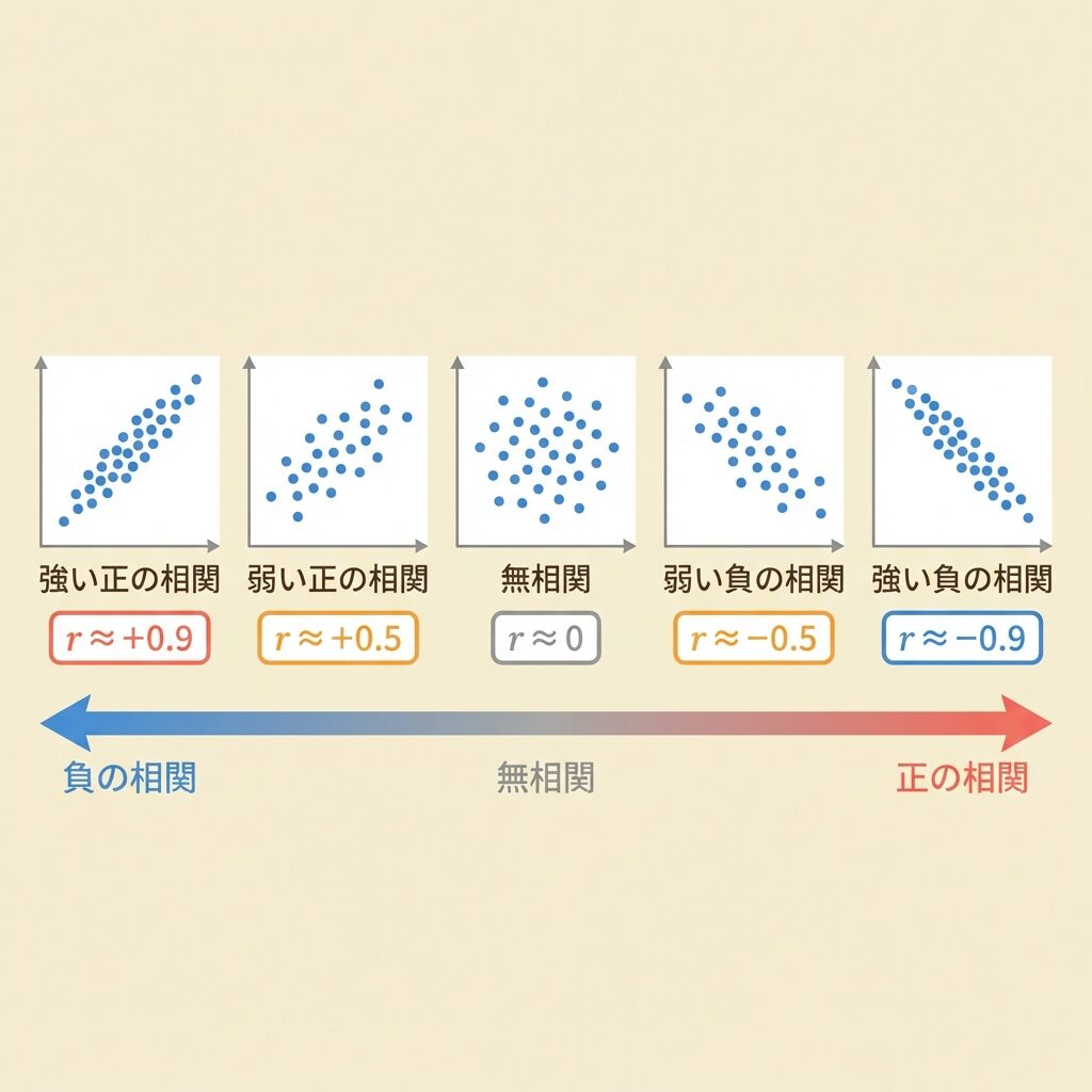 相関係数 r は必ず -1 ≦ r ≦ +1 の範囲に収まります。これは「0.3」や「-0.8」のように、1つの数値で2つのデータの関係を表現できるということです。