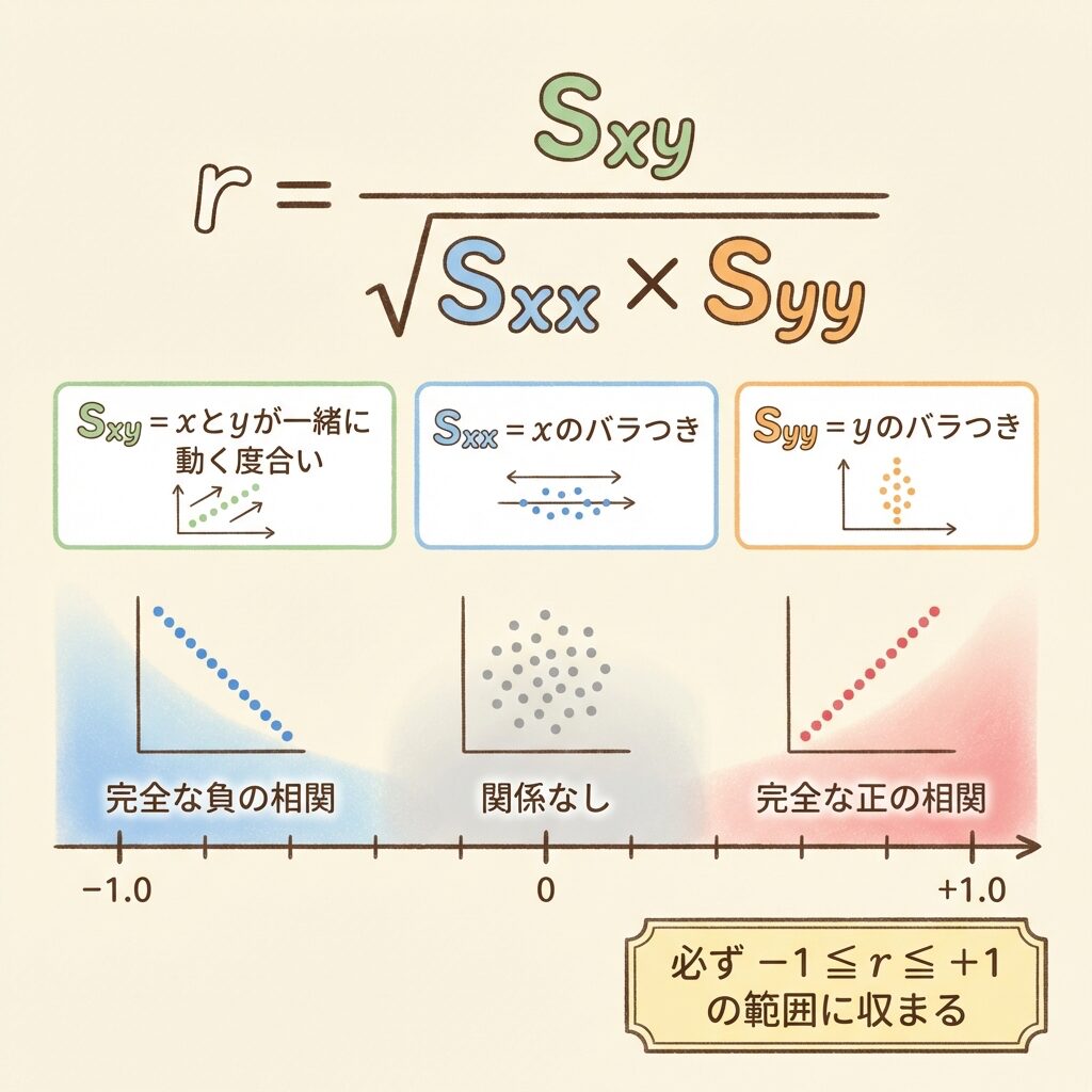 そこで、分母に「xのバラつき × yのバラつき」の平方根で割ることで、単位やスケールの影響を打ち消します。これによって r は必ず -1 ≦ r ≦ +1 の範囲に収まるようになります。