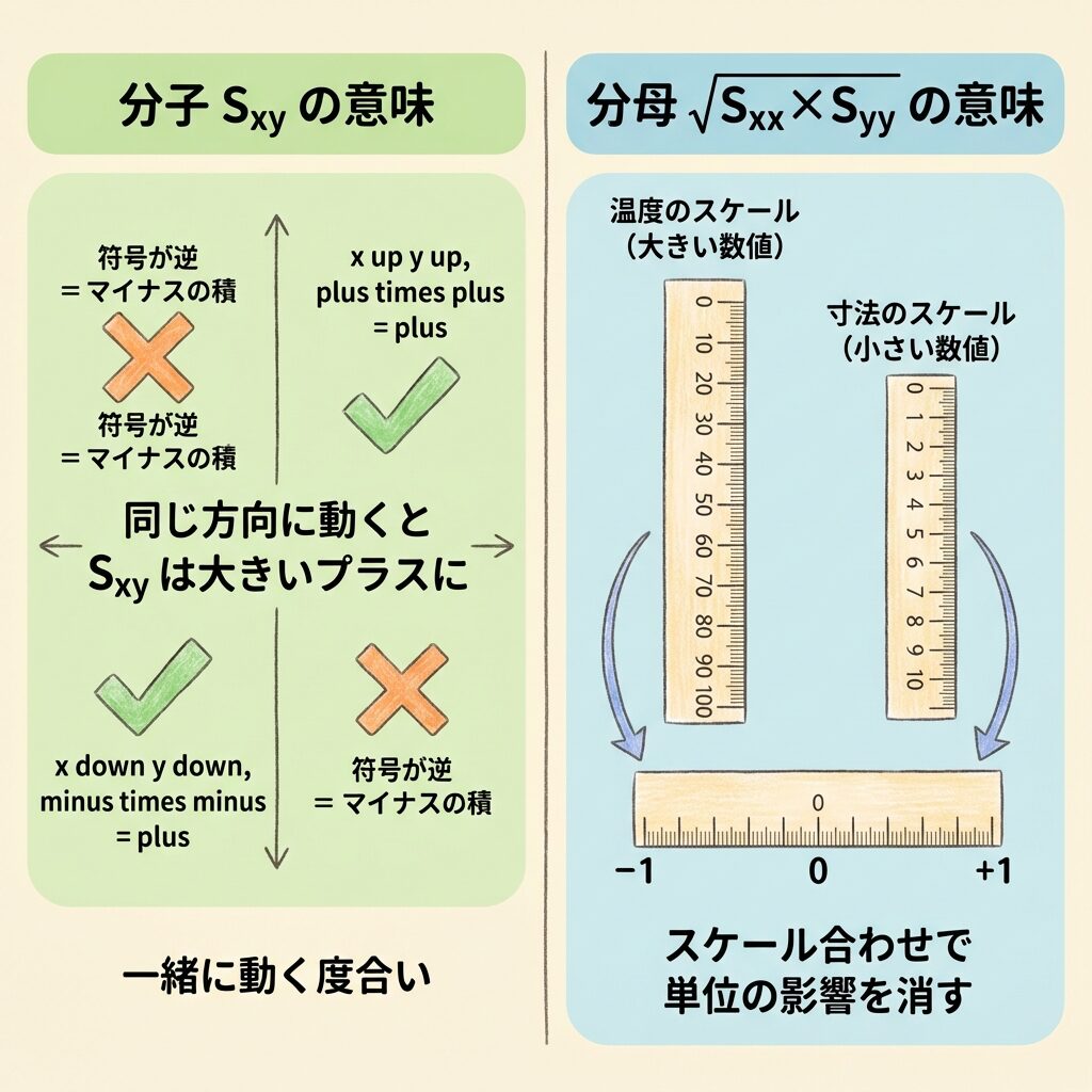 分母の √(Sxx × Syy) は「スケール合わせ」