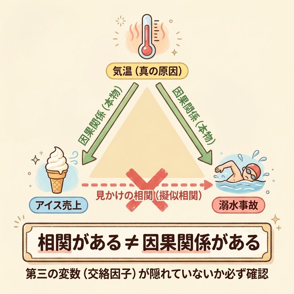 「アイスクリームの売上」と「溺水事故の件数」の月別データで散布図を描くと、強い正の相関が出ます。しかし「アイスを食べると溺れる」わけではありません。真の原因は「気温」です。気温が上がるとアイスが売れ、同時に海やプールに行く人が増えて事故も増える。このように、第三の変数(交絡因子)が裏に隠れているケースを「擬似相関」と呼びます。