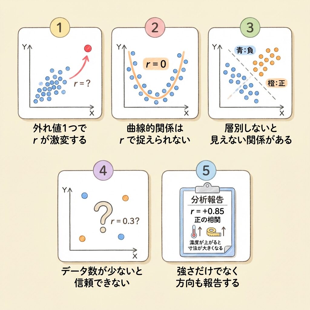 相関係数 r は外れ値(他のデータから大きく離れた値)に非常に敏感です。たった1つの異常値が混じるだけで、r = 0.3 が r = 0.8 に跳ね上がることもあります。散布図を必ず「目で」確認し、明らかにおかしい点がないかチェックしてから r を計算してください。