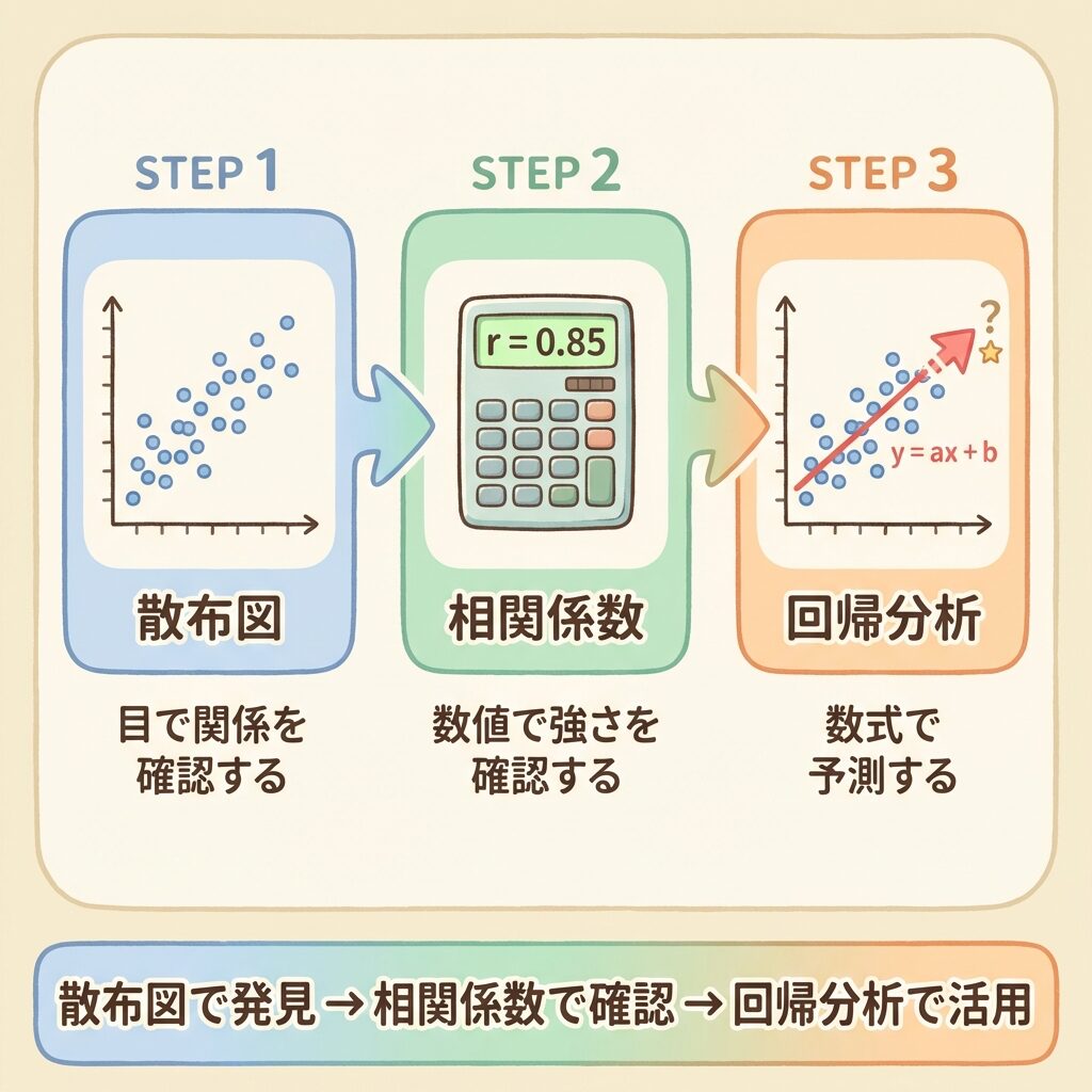 散布図と相関係数は「2つのデータに関係があるか?」を判断するための道具です。一方、回帰分析は「その関係を y = ax + b という式にして、xの値からyを予測する」ための道具です。